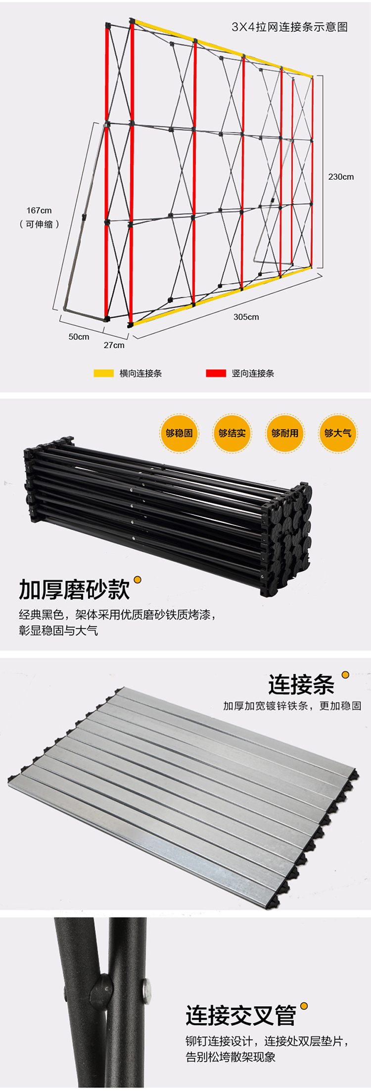 --产品特性--【品名】拉网展架经济型【产品应用】在各种促销活动中轻松自如,尺寸灵活多变,集束成捆的网架,几分钟内便弹成一个大型框架,拉网展架用简洁、现代的线条,架起不同的画面,灵活的大小规格,组装简便,形式颜色多样,种类齐全,是展销中独特的精品,轻巧、美观、方便随身携带。