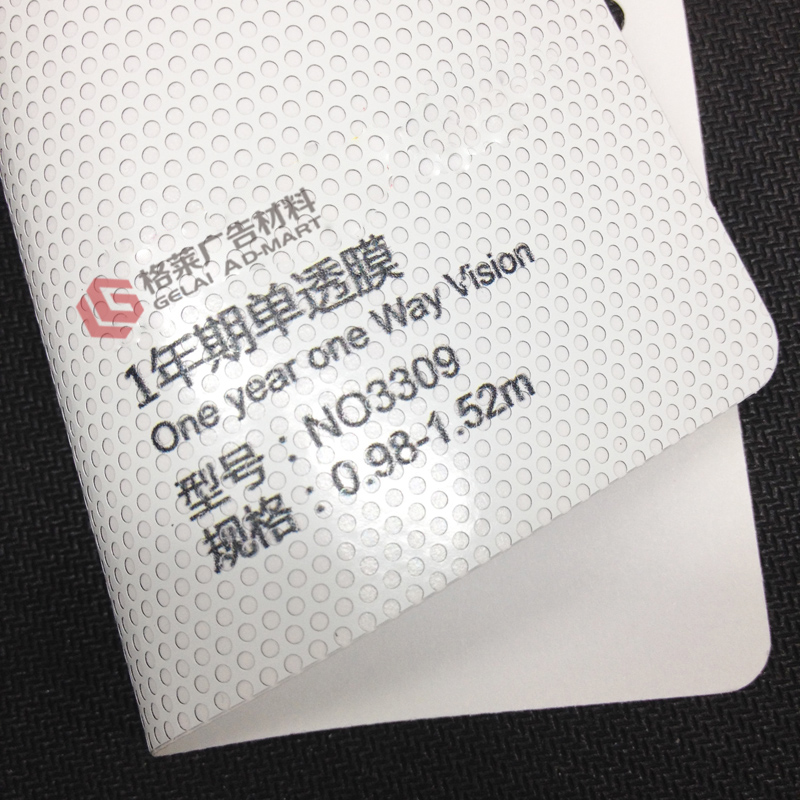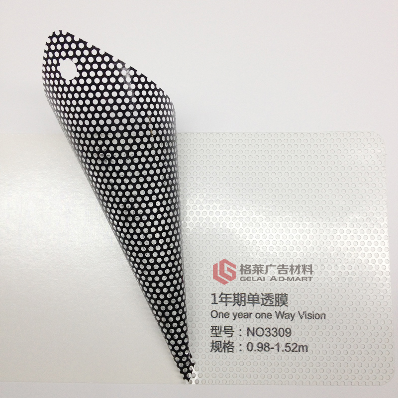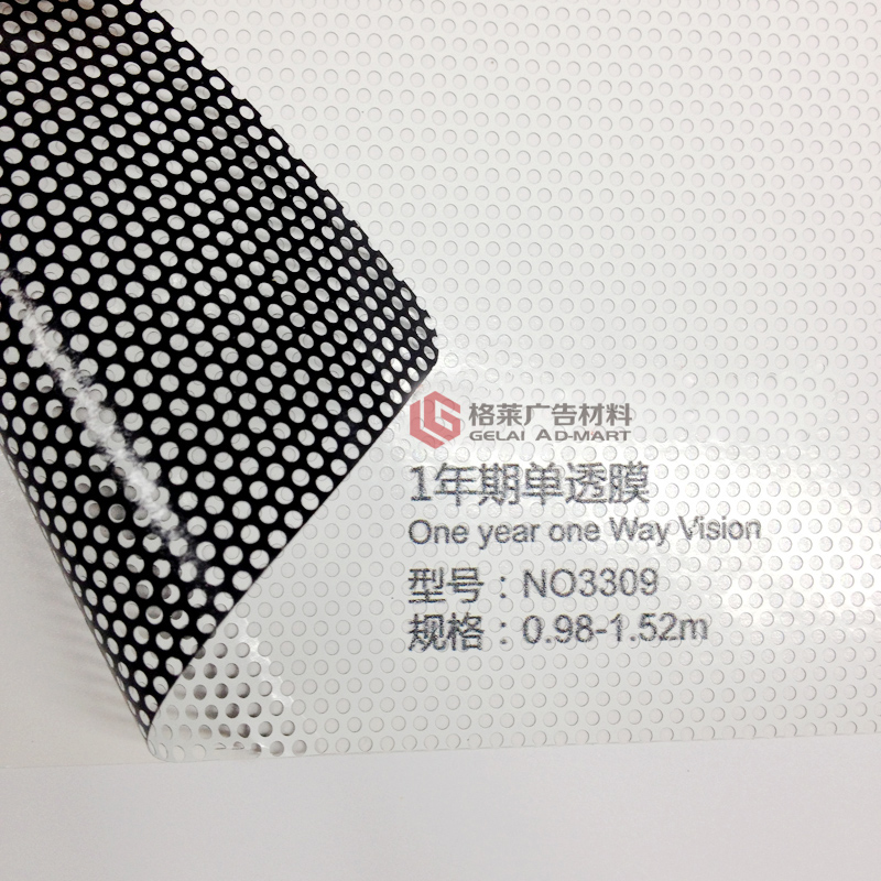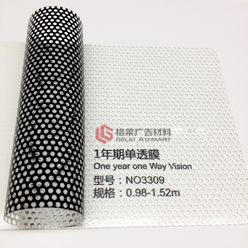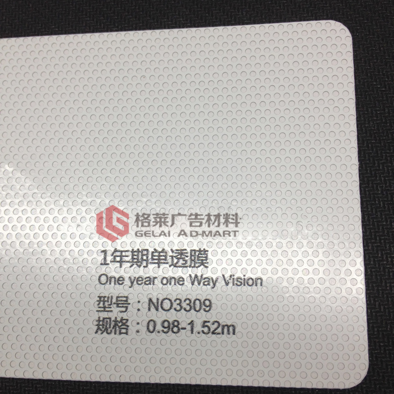NO3309单向透视膜,具备单向透视、遮光、保护个人隐私等功能,孔径1.60mm,透光率40%。产品吸墨稳定,尺寸稳定性高,适用于汽车地铁等流动媒体、玻璃幕墙装饰等。NO3309适用于各种溶剂型、弱溶剂型等印刷方式。 【品 名】:单向透视膜 【型 号】:NO3309 【面 膜】:140 micron PVC黑白膜 【孔 径】:1.60mm 【透光率】:40% 【胶 水】:半可移透明胶 【底 纸】:140gsm单面PEK硅纸 【宽 幅】:0.98/1.06/1.27/1.37/1.52m