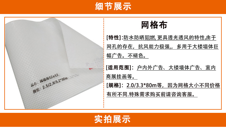 网格布【说明/特点】透风、透光、大画面阻力小强度高,可适用超大幅画面。【产品应用】户外大型广告牌、楼体广告、办公室间隔、展览展示的背景画面,风速较大的无广告背板巨幅广告画面,公共声所的遮挡画面等。【规格长度】1.5/1.8/2.2/2.5/2.8/3.2。克重:440-650克【适用机型】溶剂、弱溶剂。