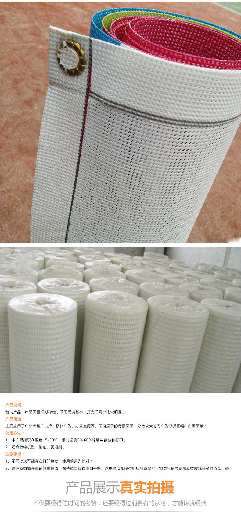 【产品应用】户外大型广告牌、楼体广告、办公室间隔、展览展示的背景画面,风速较大的无广告背板巨幅广告画面,公共声所的遮挡画面等。
