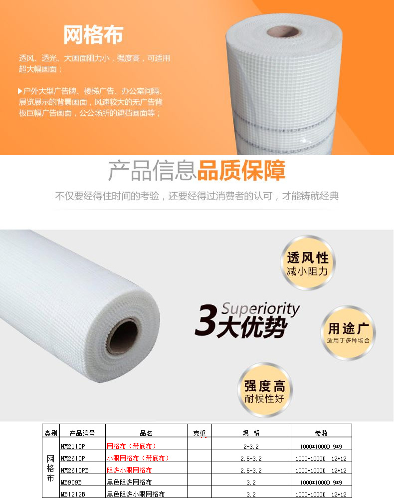 网格布【说明/特点】透风、透光、大画面阻力小强度高,可适用超大幅画面。【产品应用】户外大型广告牌、楼体广告、办公室间隔、展览展示的背景画面,风速较大的无广告背板巨幅广告画面,公共声所的遮挡画面等。【规格长度】1.5/1.8/2.2/2.5/2.8/3.2。克重:440-650克【适用机型】溶剂、弱溶剂。