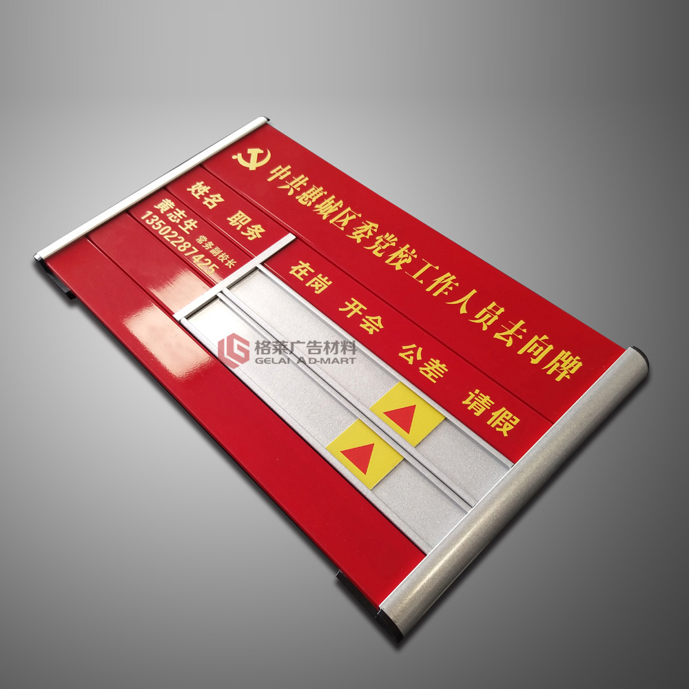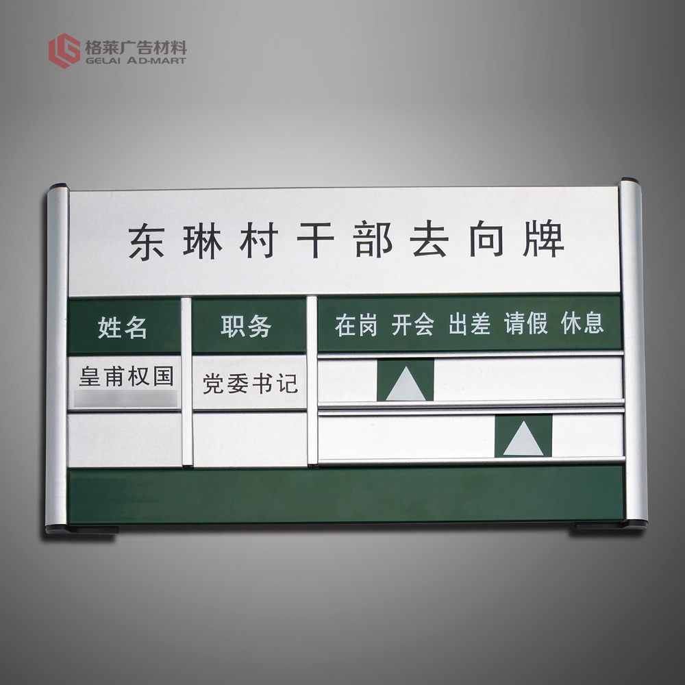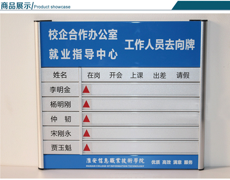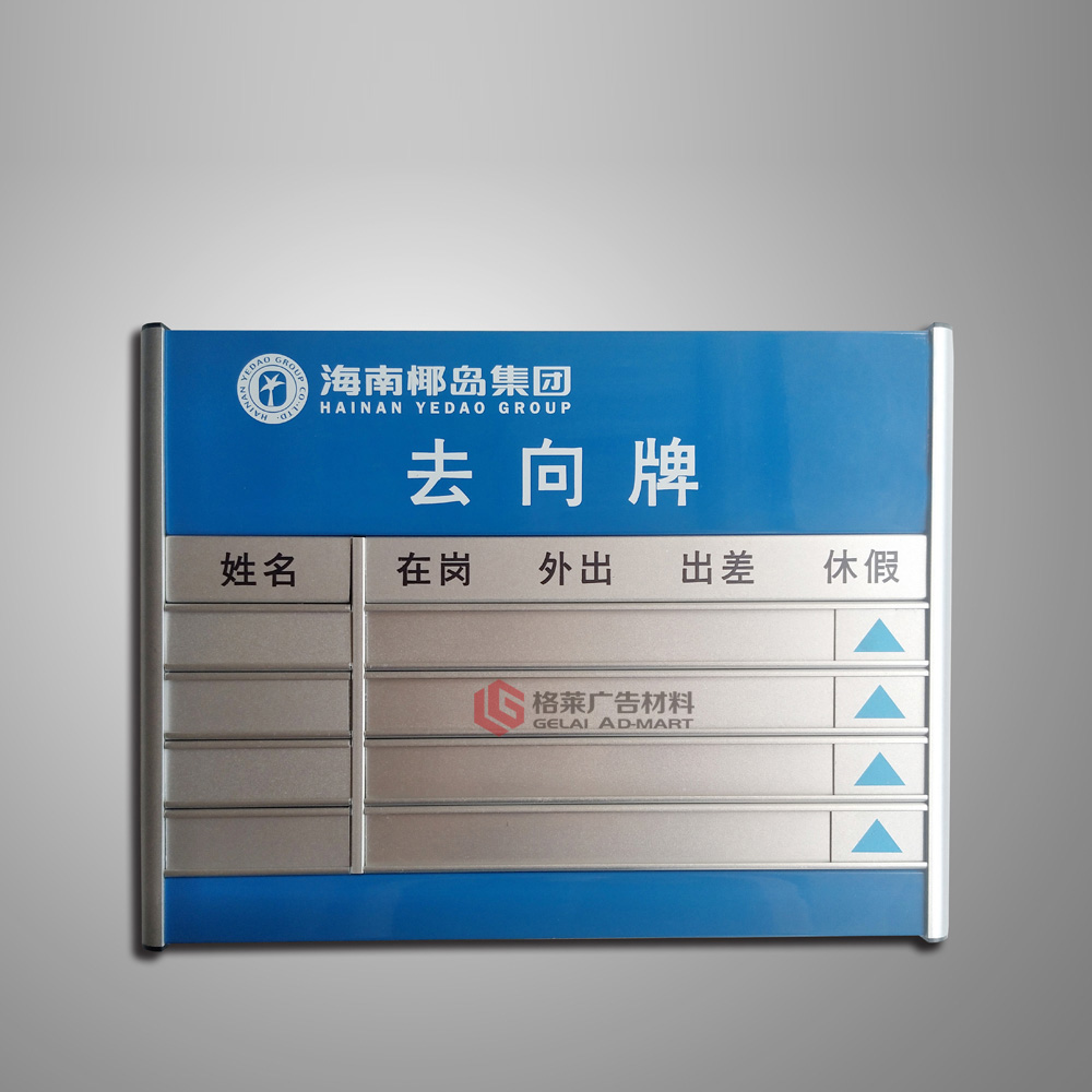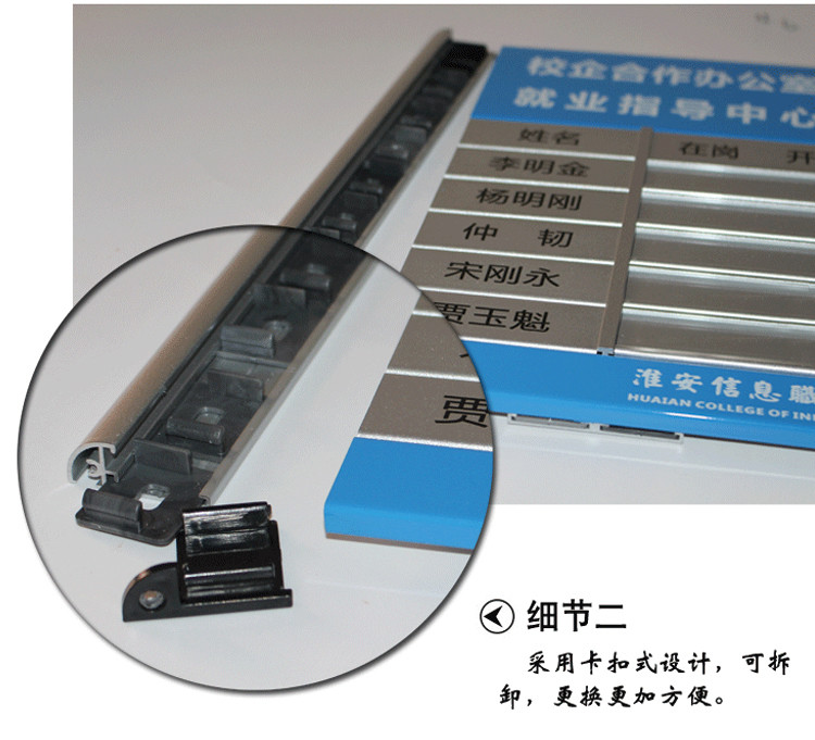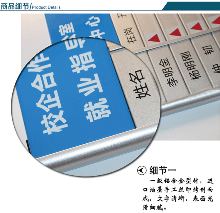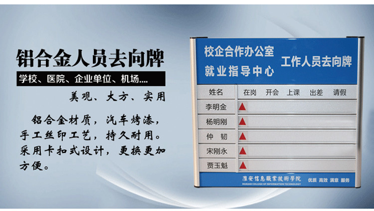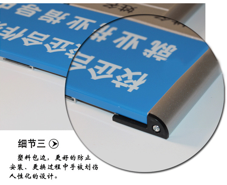 --产品特性--采用铝合金材料制成,半圆封边美观大方,汽车烤漆,手工丝印工艺,持久耐用,采用卡扣式设计,更换更加方便,塑料包边,更好防止安装更换过程中手被划伤人性化设计。广泛用于医院、学校、酒店、政府企业、机场等。