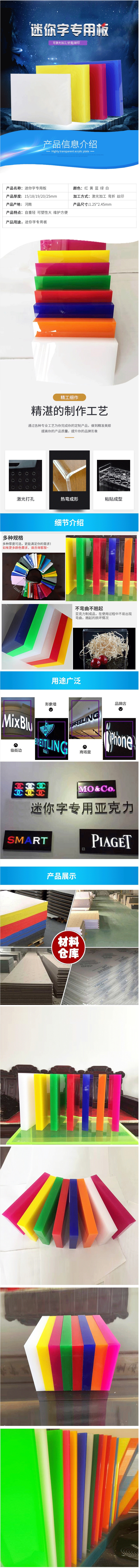 迷你字专用亚克力浇铸板通过添加特殊迷你字专用色浆,通常厚度为18.5-20mm,迷你字亚克力板耐候性强,比一般亚克力具有更优更强的抗阳光直射、抗氧化、抗雨水侵蚀等特性。 【品名】:中亚牌迷你字板 【宽幅】:1.22×2.42(乳白,红,黄) 【长度】:15mm品 名 型 号 规 格 备 注 中亚牌迷你字板 1.22×2.42(乳白,红,黄) 15mm 实际厚度14.6mm